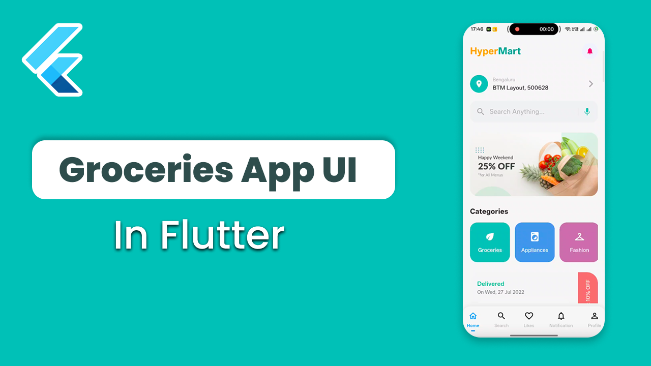 This Groceries App UI built with Flutter offers a clean, modern, and user-friendly design tailored for seamless online shopping experiences. It features a smart search bar with voice input, location-based delivery display, attractive promotional banners, and well-organized categories like groceries, appliances, and fashion. The intuitive bottom navigation ensures smooth access to key sections such as home, search, notifications, and profile. Designed with simplicity and performance in mind, this Flutter Groceries App UI is perfect for startups and developers looking to build scalable, engaging, and high-converting mobile grocery applications.